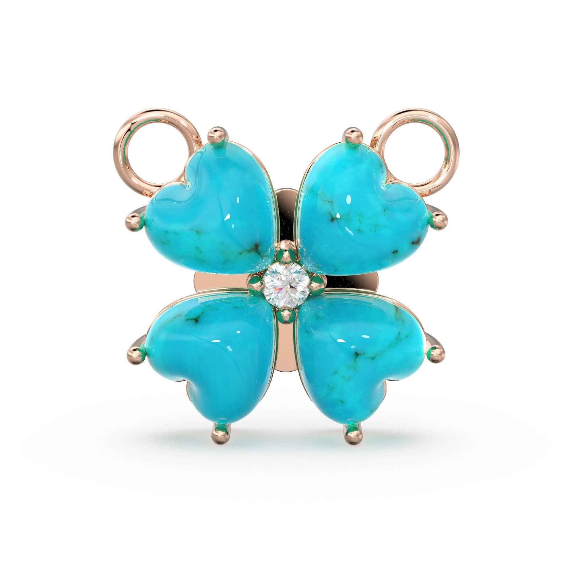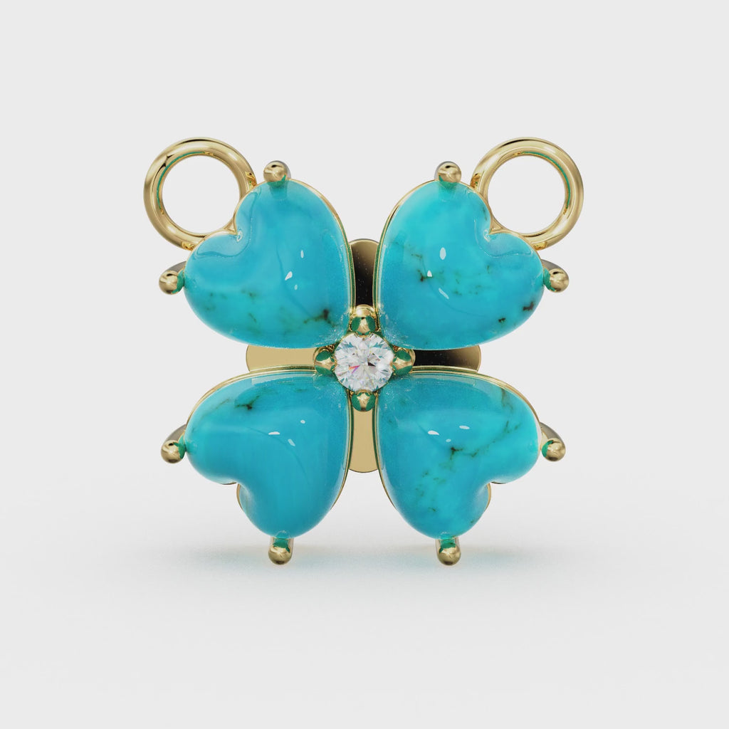 17mm LARGE 18k Yellow Gold Sleeping Beauty Turquoise Diamond Heart Shape 4 Leaf Lucky Clover Pendant Connector