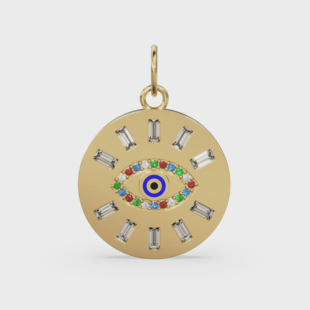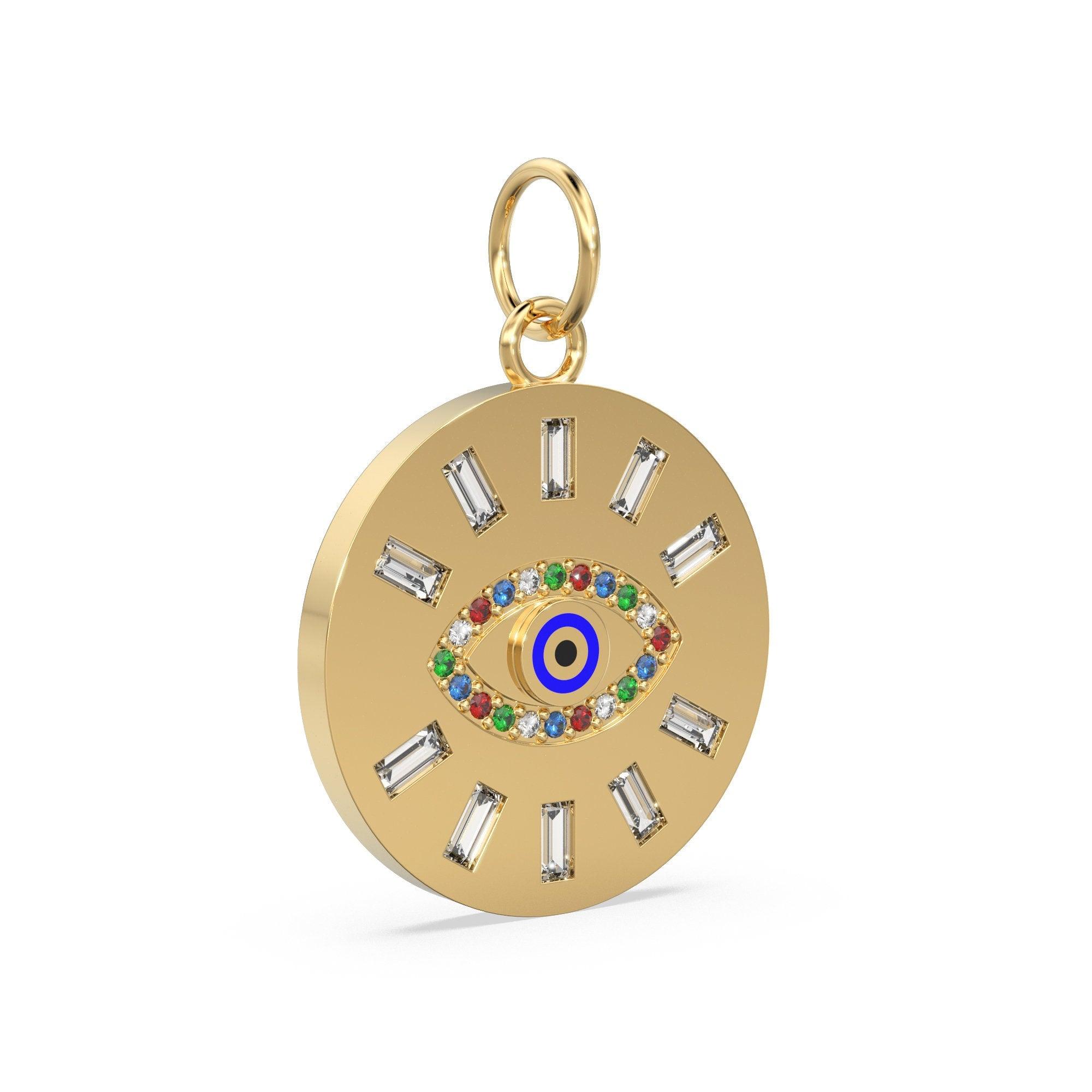 20mm Rainbow Evil Eye Enamel Baguette Diamond 18k Solid Gold Charm Pendant / Diamond Pendant, Emerald Charm Finding, Solid Gold Ruby Charm