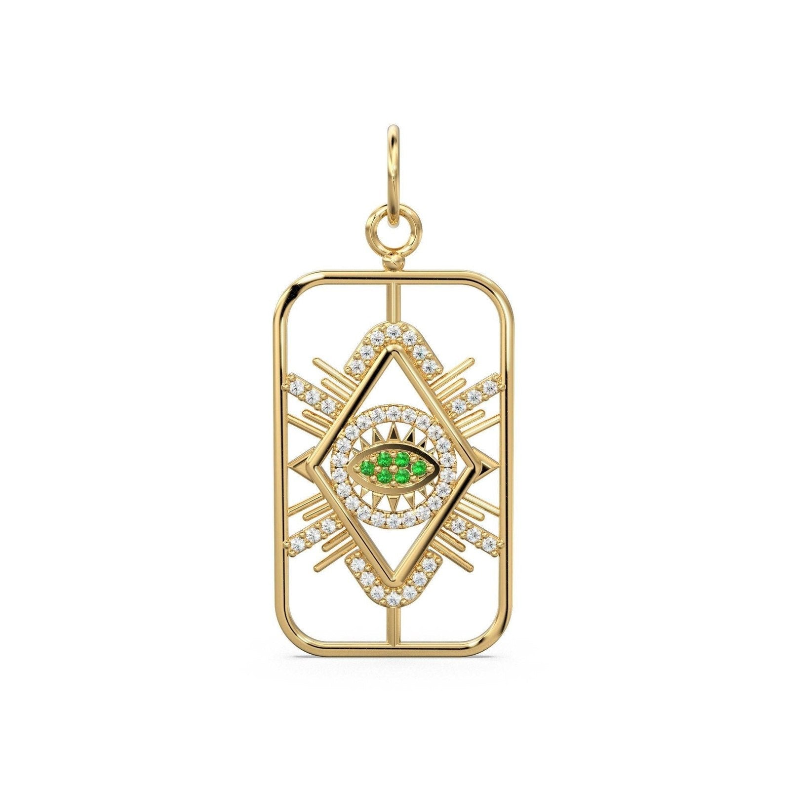 31mm Evil Eye Emerald Rectangle Pendant / Emerald 14k Solid Gold Charm Pendant / Emerald Charm / Protection Jewelry For Her