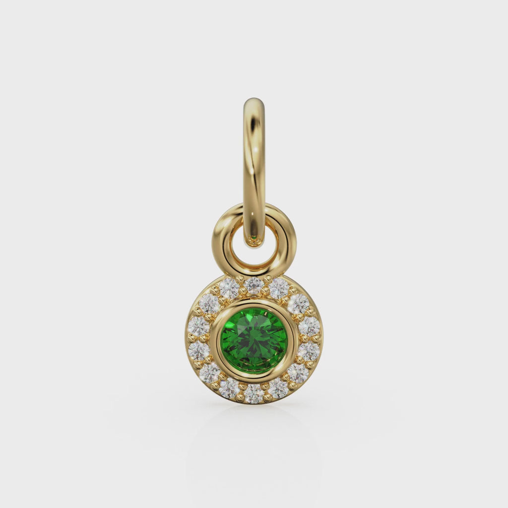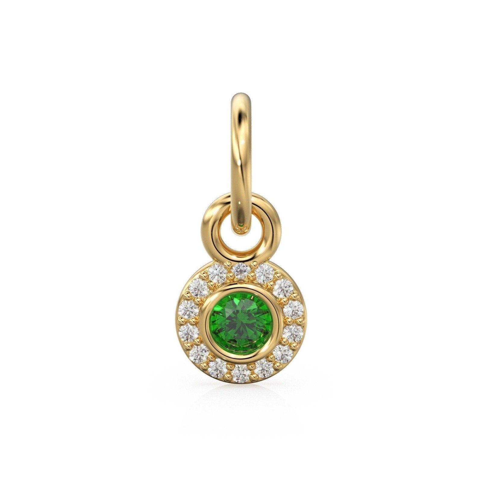 Green Emerald Disc Diamond Solid Gold Charm / Halo Gold Charm / Prong Setting Circle Charm / Real Diamond Jewelry / Diamond Gold Necklace